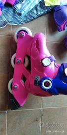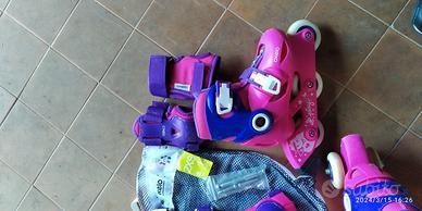 Vendo pattini-roller a 3 ruote marca OXELO Play3 (Decathlon) da bimba color rosa ,misura 26-28 regolabile + protezioni mano-gomito-ginocchia color rosa OXELO taglia 2XS il tutto USATO in OTTIMO stato, lavato ed igienizzato, normali segni usura/utilizzo.