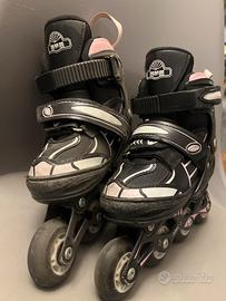 Pattini con rifiniture rosa, 4 ruote in linea. Usati ma in buone condizioni.