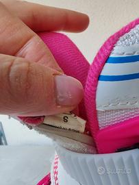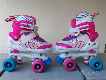 Pattini per bimba regolabili fino al numero 34. Completi di tutte le protezioni per testa, gomiti, ginocchia, ecc.