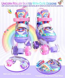【Pattini da esterno unicorno con motivi carini】 I pattini a rotelle arcobaleno sono progettati con elementi unicorno, stella e arcobaleno, che sono tutti i modelli preferiti dai bambini. Pelle glitterata olografica multicolore e cuciture in tessuto a rete ventilato, ricche di colore e lucide in ogni momento.Adottate bagliori di gelatina trasparenti rosa e verdi, non solo bei colori durante il giorno, ma anche brillantezza di notte.