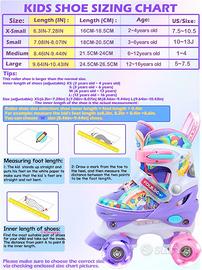 【Pattini regolabili: accompagnano più a lungo la crescita dei bambini】I pattini a rotelle regolabili di 4 dimensioni possono accompagnare il bambino per 2-3 anni. Non devi preoccuparti di cambiare spesso le scarpe a causa della rapida crescita dei piedi dei bambini. Abbiamo 4 taglie (XS / S / M / L) La taglia "XS" è adatta a bambini di età compresa tra 2-4 anni. La taglia "S" è per bambini dai 3 ai 6 anni. La taglia "M" è per bambini dai 6 ai 12 anni.