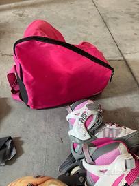 Pattini da bambina in ottimo stato dotati di ginocchiere,gomitiere,guanti ,caschetto e borsone.