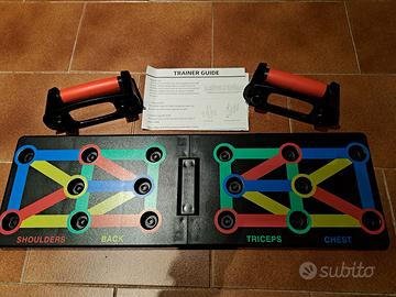Pedana supporto pieghevole con maniglie per 12 esercizi diversi di allenamento, tra flessioni, push up e plank.