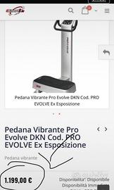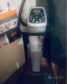 Pedana vibrante professionale pro ultimo modello Evolve La pedana ha una struttura in acciaio inossidabile e riesce a supportare un peso massimo per utente pari a 140 kg. Dotato di un motore con potenza massima di 900 Watt, con raffredamento ad aria, assorbimento medio corrente di 0.4 A. E' dotata di un piatto che vibra in senso verticale, grazie ha un motore e con l'ausilio di supporti elastici. Ampiezza di vibrazione automatica, per la massima sicurezza dell'utente in autoutilizzo 1.8 mm a 3.9 mm. Frequenze di vibrazione: 20 - 25 - 30 - 35 - 40-45-50 Hz. Dotata di una pratica e semplice console a tasti a membrana, che cosnete di impostare i priogrammi di allenamento. In memoria troviamo 5 prgrammi e 1 manuale. Dimensioni: 65 × 74 × 151 cm. Dimensioni piatto vibrante: 70 × 33 cm.