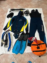 Vendo set completo per Apnea/pesca subacquea usata in buone condizioni il kit comprende:muta in neoprene taglia 48/50 di 7 mm della Cressi-sub, fucile ad aria compressa marca Omer + pinne 42/43+cintura con pesi+bandiera di segnalazione+ guanti+maschera…. Si vende l’intero kit.
