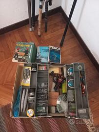 Vendo 5 canne da pesca, due dotate di mulinello. una di queste due ha una marca: Shakespeare Century XXI. Lunghezza: 240 cm Specifiche: 15-60 g Utilizzo: Adatta per la pesca in acqua dolce e salata inoltre 4 libri, una cassetta con altro materiale per la pesca (vedi foto), e un retino telescopico ripiegabile marca Caperlan e un mulinello per sinistrorsi.