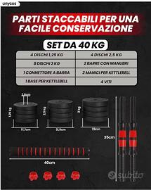Vendo per inutilizzo pesi totali 40kg. Manca solo 1 dei 4 ferma pesi rossi tondi in foto, ce ne sono solo 3. A parte questo è tutto in ottime condizioni.