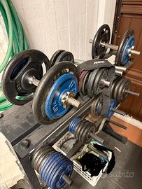 Vendo dischi per un totale di 89kg, bilanciere Ez 25mm, straps e 5 manubri , di cui 2 da 28mm e 3 da 25mm.