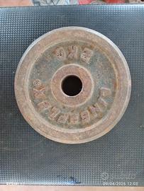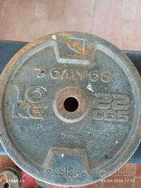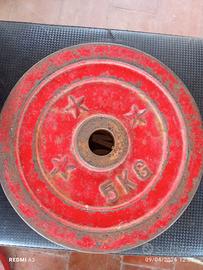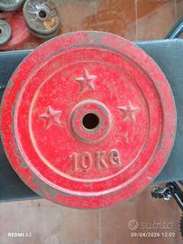 6 dischi da 10kg (4 rossi lineaflex con foro 28mm e 2 neri domyos con foro 30mm) 1 disco da 5kg lineaflex foro 28mm 2 dischi da 2kg lineaflex con foro 28mm Totale 69kg...i dischi sono un po' vecchi e un po' arrugginiti ma fanno il loro lavoro e li vendo a solo un euro al kg... prezzo abbastanza imbattibile. Ritiro solo a mano