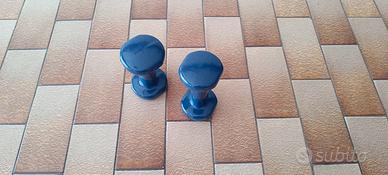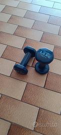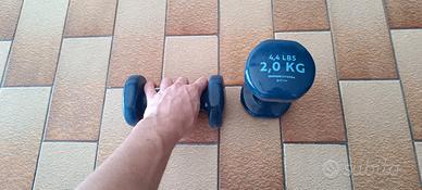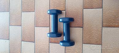 ho due manubri in gomma che pesano 2 Kili l'uno. usati poco comprati alla Decathlon a 15 euro. sotto ottimi se cadono perché essendo rivestiti in gomma non sfondano il pavimento.