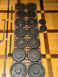 Vendo dischi in ghisa 25 mm ad 1.50 al kg si tratta di 4 dischi da 10 kg - 10 dischi da 5 kg. - 4 dischi da 2 kg - 1 Bilanciere 25 mm. da 1.80 mt. 25 euro - 1 bilanciere 25 mm. da 1.30 mt. 15 euro - 1 manubrio lungo da 0.50 mt 10 euro tutti filettati con fermi a vite di acciaio - 1 rack portapesi 35 euro in blocco euro 170 solo ritiro a mano no offerte ridicole