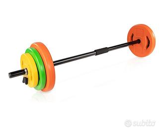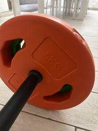 Tunturi 14TUSCL353 Pesi Palestra per Allenamento Aerobico - Dischi Palestra in Plastica - 1 Barra Componibile inclusa 20 kg Completo con 6 dischi cemento colorato 2X 5 kg arancia, 2X 2, 5 kg verdi e 2X 1, 5 kg giallo 1 divisibile barra cava e una coppia di molle collari di clip (Consegna a nuoro e dintorni direttamente di persona)