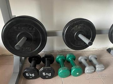 Pesi, manubri e bilancieri da palestra di diversa dimensione.