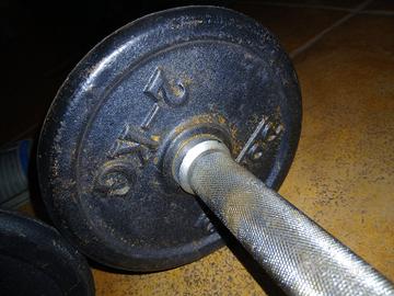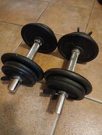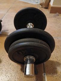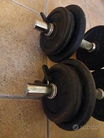 vendo pesi in ghisa, materiale duro, resistente compatto. sono inclusi: 2 piccoli manubri, 4 dischi da 2 kg, 8 dischi da 1 kg, 4 pinze ferma dischi.