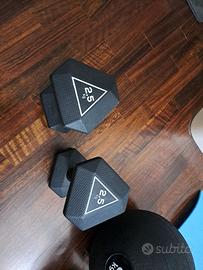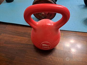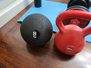 2 manubri con 8 dischi da 5 kg e 4 dischi da 2 kg, una palla da 8 kg, una kettlebell da 10 kg e 2 manubri da 2.5 kg.