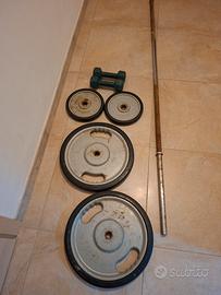 2 dischi da 20kg,2 da 5kg,due manubri da 3kg e un bilanciere.