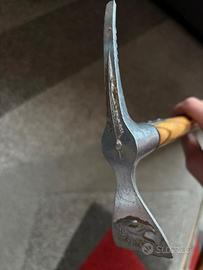 Splendida piccozza classica da montagna, un vero pezzo di storia dell'alpinismo. Perfetta per collezionisti, amanti della montagna o come ricercato oggetto d'arredo vintage. ## CARATTERISTICHE ## Materiali: Robusto manico originale in legno sagomato e testa in acciaio con una bellissima patina del tempo. Incisione: Presenta un'elegante incisione a forma di aquila sulla parte piatta (paletta), segno di una manifattura di qualità superiore. Componenti: Completa di becco seghettato, paletta e puntale metallico inferiore originale. Condizioni: Ottime condizioni vintage. La struttura è solida, il legno non presenta crepe e il metallo ha quel fascino vissuto che solo gli oggetti d'epoca possiedono. ## PREZZO ## Prezzo: 60 euro / trattabili.