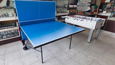 Ping pong garlando progress outdoor nuovo Prezzo in offerta 460iva inclusa In omaggio 2racchette e set di palline visita il nostro shop su LUCARTECBILIARDI.IT Trasporto e montaggio escluso Spedizione gratuita CARATTERISTICHE Modello per esterno, pieghevole con chiusura automatica compatta, con misure regolamentari da torneo, è l'ideale per l'uso familiare e il gioco amatoriale. Struttura del piano di gioco in resina melaminica (spessore mm. 3.5) con profilo metallico spessore mm.36, con linee bianche indelebili e finitura antiriflesso. Rete e tendirete permanenti in dotazione , non è necessario smontarli per piegare il tavolo. Telaio e gambe: struttura tubolare metallica diametro mm. 25, con verniciatura a polvere. In dotazione porta palline. Quattro ruote doppie (diametro mm. 125), tutte rotanti a 360° facilitano gli spostamenti. Misure regolamentari da torneo (cm. 274x152,5x76) Sollevando uno dei due piani è possibile giocare da soli. Il tavolo è adatto all'uso da parte di persone con ridotta mobilità. Misure da Chiuso: 69 cm di profondità 184 cm di larghezza con rete montata ( 152,5 cm con rete smontata) 163 cm di altezza. Per ulteriori informazioni o preventivi su ping pong, calcio balilla, carambola,biliardo, biliardino non esitate a contattarci Lucartec biliardi