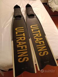 Pinne lunghe da pesca o Apnea in vetroresina Ultrafins montate su scarpette Beuchat Mundial misura 43-44, durezza 4 (1 è il più morbido 5 il più duro), com segni di usura, perfettamente funzionanti