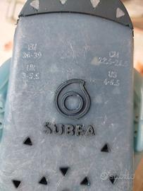 Vendo due paia di pinne per bambini della Decathlon. Segnate nella parte inferiore dalla sabbia ma usate veramente 2 volte in quanto i miei figli non sono molto avvezzi all'acqua. Primo paio blu scuro taglia 36-39 Secondo paio azzurro 32-35.