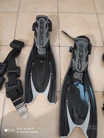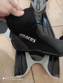 Pinne della Cressi taglia S/M e Stivale con cerniera Mares taglia 6, equivale a n. 38/39. In perfette condizioni. Non disponibili cintura e guanti.