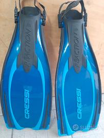 Vendo pinne Cressi Reaction ideali per immersioni con le bombole. Usate 3/4 volte Misura 41/44 regolabili tramite cinturino.