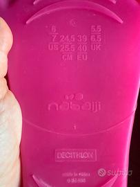 Pinne rosa , marca nabaiji (Decathlon), misura 39/49, indossate pochissimo. Praticamente nuove,lunghezza 33 cm,larghezza parte anteriore 16 cm. Visionabili, ritiro a cura dell’ acquirente se nella mia zona.