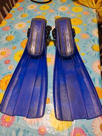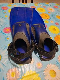 Pinne taglia l/XL io con 42 e scarpette andavo bene. Molto usate parecchi graffi da usura ma fanno il loro lavoro per chi deve iniziare.