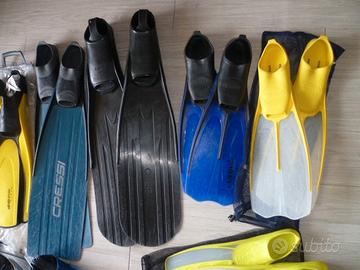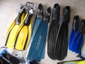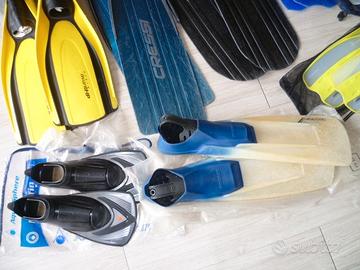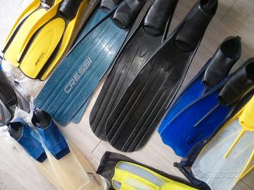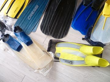Vendo per esubero le seguenti pinne per pesca subacquea, apnea, snorkeling e nuoto: Pinne Cressi Gara 2000 40-41 ottimo stato 25 euro Pinne Omer Tuna taglia 46-48, scarpette Valerio Grassi con pala intercambiabile, perfette per piede 44-45 con calzare da 5 mm, ottimo stato 30 euro Pinne Mares Explorer blu 42-43, buono stato 10 euro Pinne Mares Explorer gialle 42-43, buono stato 10 euro Pinne Mares Challenge 34-35 con sacca rete nuove mai usate 10 euro Pinne Mares Plana Avanti HP gialle 42-43 buono stato 20 euro Pinne Mares Radial 42-43, molto usate 5 euro Pinne Aqua Sphere Microfin Iron taglia 38-39, in confezione originale, per allenamento nuoto in piscina o al mare, nuove mai utilizzate, in perfetto stato, 20 euro Tel. 3498108197 Per il pagamento bonifico bancario in caso di spedizione oppure ritiro diretto SOLO INTERESSATI Grazie