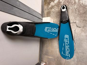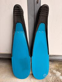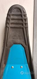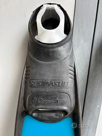 Pinne H. Dessault Sporasub a pala lunga intercambiabile in tecnopolimero di alta qualità. Colore azzurro. Scarpetta in gomma ergonomica a spessore differenziato connessa alla pala con due viti inox facilmente smontabili per ottimizzare eventuale trasporto ed ingombro. Ideale per la pesca in apnea o immersioni con ARA. Come nuove, mai utilizzate.