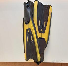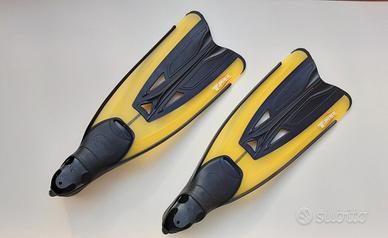 Pinne da sub usate, in buone condizioni. Sono di colore giallo e nero, con il logo T-Max. - Colore giallo e nero - Marca: T-Max - 2 pinne