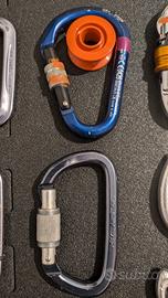 pirana petzl , parallelo lega petzl ghiera 28kn, pera asimmetrico con sicurezza 25 kn (petzl per pirana), pera simmetrica 22 kn, carrucola petzl, 2 Spirit petz per longe, parallelo lega 22kn, salewa top 28kn