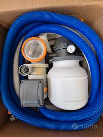 Piscina completa con filtro/pompa a sabbia/cotone +skimmer filtrante, telo riscalda acqua, telo coprente nero, scaletta integra + robottino pulizia fondale nuovo. Molto bella!!! Usata una stagione vendo per inutilizzo. Vendo pacchetto completo