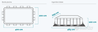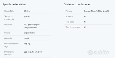 Si fornisce telo copri piscina, ricambio filtro pompa, prodotti chimici e materiale per mantenimento acqua durante l'utilizzo.