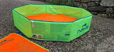 Piscina pieghevole, leggera, facile da riempire e trasportare. Si monta in due secondi, non necessita di gonfiaggio. Dimensione montata 120 cm, bordo circa 24 cm, volume acqua 180 litri.