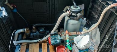 Compresi nel prezzo 2 pompe 1 per la circolazione dell'acqua per filtro 2 una pompa per lo svuotamento con relativi raccordi, tutte le valvole di chiusura del circuito per la manutenzione . Cassone in PVC per contenere tutte le attrezzature , pompe , timer filtro ecc. Scaletta e accessori vari. Telo di copertura in PVC fatto su misura da materiale per copertura dei tir, molti resistente. Ovviamente essendo non utilizzata da più di un anno sarà necessario un po' di manutenzione. La piscina si trova a Finale Ligure può essere vista di persona dal potenziale acquirente.