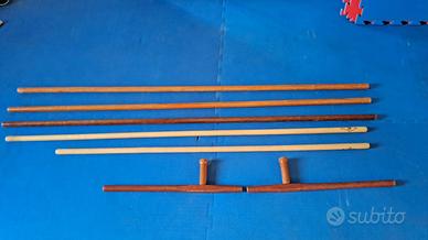 Vendo un porta bastoni, un porta spade utilizzabile anche come portabastoni, sei bastoni e una coppia di bastoni con manico. Tutto in legno