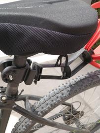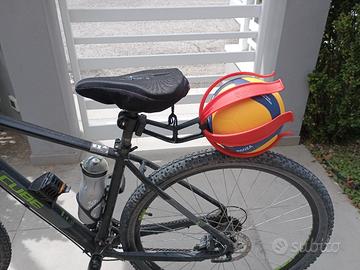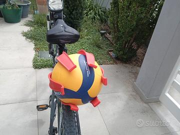 Porta pallone KIK BALL. Accessorio per bici, per portare facilmente dei palloni con sé. Dispone di un braccio staccabile da agganciare alla bastone della sella della bici. La componentistica rossa è ciò che avvolge il pallone e consiste in 6 braccia mobili che si regolano in base alla grandezza del pallone. Può contenere palloni da pallavolo, basket, calcio, rugby, football e altri tipi simili.
