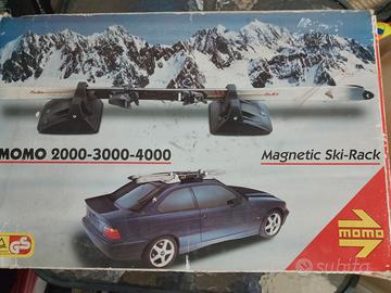 Supporto Momo design a calamita con gomma antigraffio x il tetto auto con chiavi di chiusura, accoglie due paia di sci, con possibilità di consegna su Canicattì, Caltanissetta, Enna, Catania e Giardini Naxos.