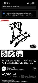 Vendo portabici per portellone posteriore per Auto per trasporto di due e bike portata 45 kg vendo per cambio auto e questo modello non si adatta alla mia. Prima consiglio di verificare sul sito del produttore la compatibilità con la propria auto (non adatto con spoiler sporgente). Il modello é GP modello Sinergy. Disponibile a spedizione con spese a carico dell’acquirente.