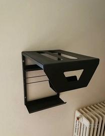Portabici da parete / muro in acciaio molto robusto verniciatura metallizzata. Da fissare al muro all'altezza voluta, per mtb e bici da corsa. Spugna di protezione dove appoggia il telaio. Vari ripiani studiati per casco, occhiali, scarpe, ricambi e chiavi..per avere tutto in ordine e a portata di mano. Viene fornito con 4 tasselli per fissarlo al muro. Fabbricazione artigianale, saldatura a tig.