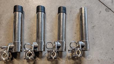 • 4 portacanne in acciaio inox con attacco a morsetto per tubo diametro 26mm (regolabili in inclinazione, completi di ghiera di blocco e tappo in gomma) tranne uno al quale manca tappo in gomma diametro tubolare 43mm