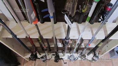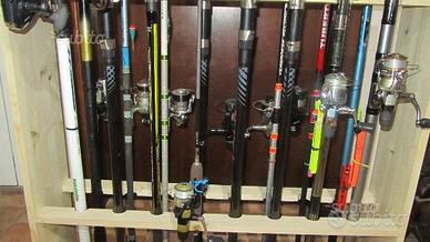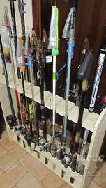 portacanne in legno di abete, si può verniciare neutro oppure castagno, può andare bene per quasi tutti i tipi di canne da pesca sia da mare che da lago o laghetto, come si vede dalla foto va bene per canne da surf casting, spinning, bolognese, trota lago tremarella, da punta fisse