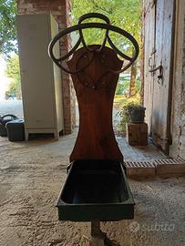 Portasella con ruote. Struttura in metallo e legno. Cassetto portaoggetti estraibile in plastica.