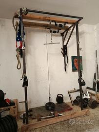 Rack artigianale completamente smontabile con puleggia e barra trazioni(pesi esclusi). Altezza da terra 220 cm.