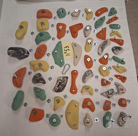 Vendo 53 prese DTG nuove di vari colori, a 5 misure fatte di resina composta a 146€ Viti e ragneti M10 svasate in *OMAGGIO* adatte per pannelli da 18/22mm di spessore. Prese studiate per non non avere traumi alle falangi, senza spigoli. Le prese sono cosi composte: 10 appoggi 12 piccole 17 medio-piccole 10 medie 4 medio-grandi Adatte soprattutto per far arrampicare bambini, palestre ecc ecc. Quantitativo di prese adatte per pareti da 9/10mq circa. Le prese sono tutte una diversa dall'altra. Per info contattare elefonicamente al 338-5668286. Dario. tel 3385668286 per info . Producevo grossi quantitativi da 25 anni per la GAZMAX, rifornitore dei più grossi negozi di articoli sportivi come LONGONI, CISALFA, GIACOMELLI ecc ecc. Dal 2019 abbiamo cessato l'attività, ma trovandomi con stampi di ultima generazione ed essendo in pensione continuo a produrre piccoli quantitativi per privati.
