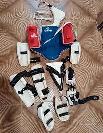 Protezioni per combattimento erroneamente taekwondo marca Daedo / Tusah, in condizioni buone/ottime ,compreso protezione piedi e mani., borsone Errea e sacchetto. Tutto visibile in foto, scritture a pennarello all interno delle protezioni come identificativo. Misure in centimetri presenti nelle ultime foto. Taglia adatta per ragazzo di 9/10/11 anni