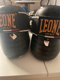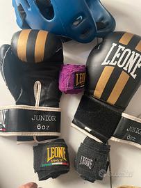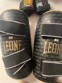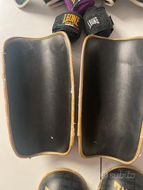 Protezioni per kick boxing, Leone, usate. Fasce diverse in omaggio. E’ possibile avere anche la griglia per caschetto, NON compatibile con il caschetto in vendita. Lato dorato dei Parastinchi un po’ consumato