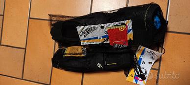 protezioni ginocchia/tibia e gomito/avambraccio per utilizzo in bici. snodo in gomma e imbottitura interna. chiusura tre punti con velcro elastico. bordatura in silicone.