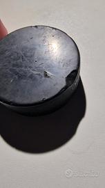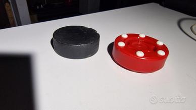 2 dischi "puck" hockey. Puck rosso nuovo, mai usato, essenzialmente per il gioco in strada. Puck nero originale usa in partite serie A IHL, presenta scheggiatura da utilizzo.